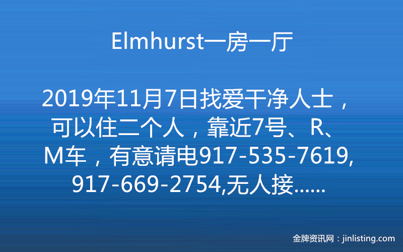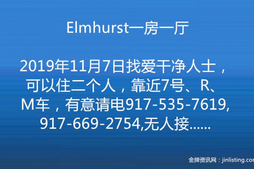 Elmhurst一房一厅 ,找爱干净人士,可以住二个人,靠近7号、R、M车,有意请电917-535-7619,917-669-2754,无人接听可以短信留言