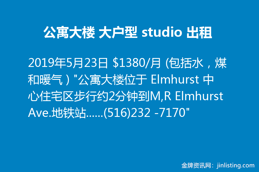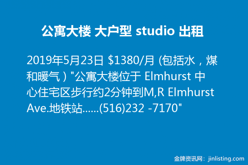 公寓大楼 大户型 studio 出租 $1380/月 (包括水,煤和暖气 ) “公寓大楼位于 Elmhurst 中心住宅区,步行约2分钟到 M,R Elmhurst Ave.地铁站, 也可步行至F,E,7号站。去曼哈顿仅需20分钟。 大楼环境佳。购物,餐饮应有尽有,生活机能完善。 公寓内设有洗衣机,烘干机。无需外出洗衣,方便省时。 难得大户型 STUDIO 出租 $1380/月 (包括水,煤和暖气 ) 大楼管理的非常棒。管理员随叫随到,人很好,不用担心有关住宅硬件的任何问题。 STUDIO宽敞明亮内有4个closets 和1个更衣室,储物空间大。室内配有简单家具,随时入住。 欢迎有稳定收入的朋友和同学们入住,相信您一定会住得满意。如有意者请text message 给我(屋主 ) Kathleen (516)232 -7170”