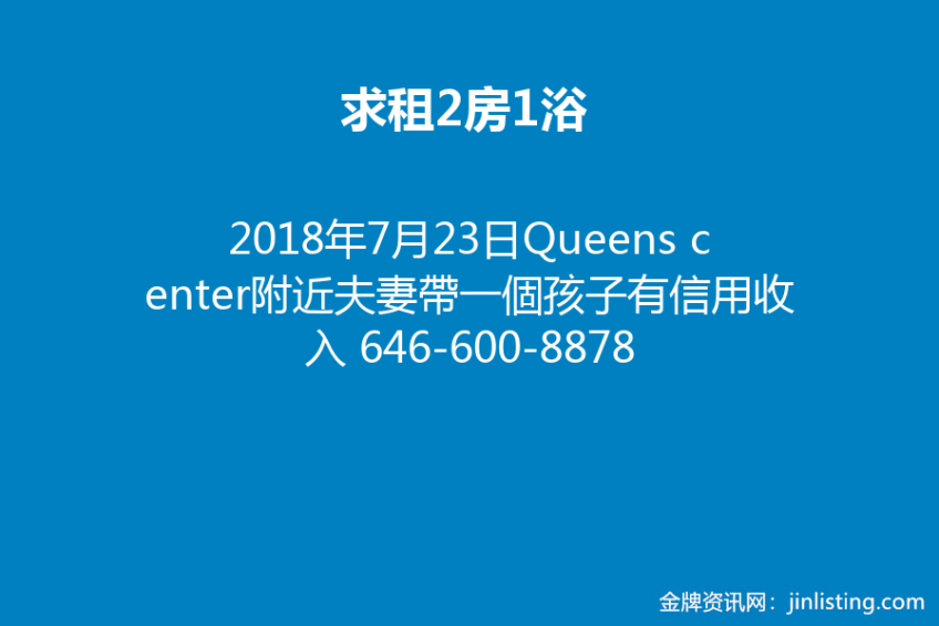 求租2房1浴 Elmhurst &Corona,Queens center附近不超過2000,夫妻帶一個孩子(成人)有信用收入。吳646-600-8878