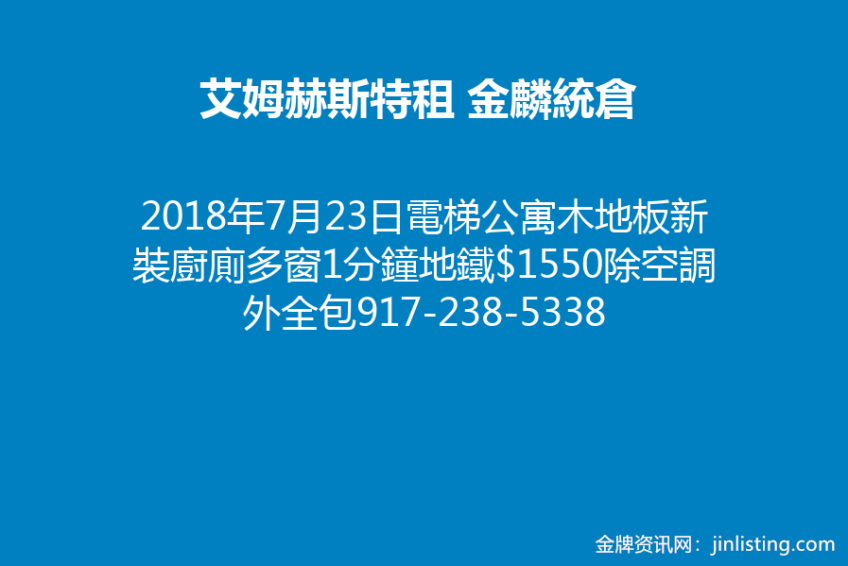 電梯公寓木地板新裝廚廁多窗1分鐘地鐵$1550除空調外全包917-238-5338 718-786-2866