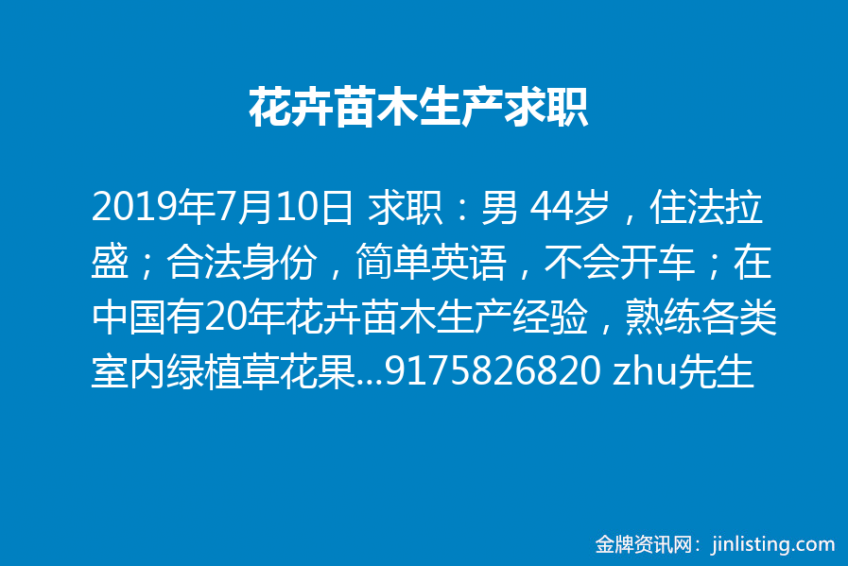 花卉苗木生产求职 求职:男 44岁,住法拉盛;合法身份,简单英语,不会开车;在中国有20年花卉苗木生产经验,熟练各类室内绿植草花果树尤其是多肉植物等等的繁育生产管理技术。求接送。有意者请联系9175826820 zhu先生