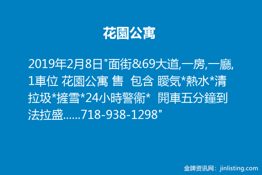 “面街&69大道,一房,一廳,1車位*** 花園公寓***售*** 包含*** 瞹気*熱水*清拉圾*摌雪*24小時警衞* ***開車五分鐘到法拉盛*** ***巴士Q44,Q2O,Q2OA,4站到法拉盛,圖書錧.* 巴士Q64*上下車2站到森林小丘*皇后大道*扡鉃站*F快車*到曼哈頓 ******開車1O分鐘那瓜地 &J,F,K機場.******* 詳情請電話連絡KW地産經紀 718-938-1298”