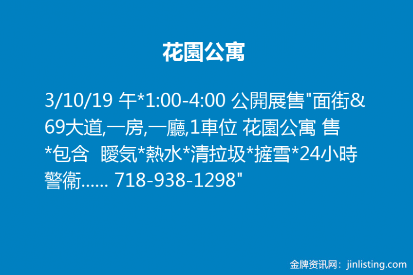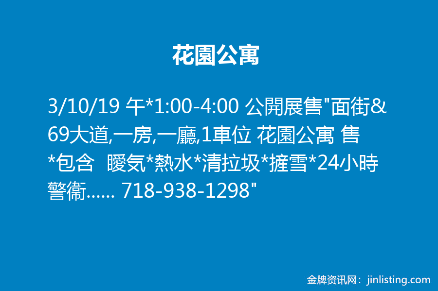 *** 花園公寓***3/10/19***午*1:00-4:00***公開展售*** “面街&69大道,一房,一廳,1車位*** 花園公寓***售*** *包含*** 瞹気*熱水*清拉圾*摌雪*24小時警衞* ***開車五分鐘到法拉盛*** ***巴士Q44,Q2O,Q2OA,4站到法拉盛,圖書錧.* 巴士Q64*上下車2站到森林小丘*皇后大道*扡鉃站*F快車*到曼哈頓 ******開車1O分鐘那瓜地 &J,F,K機場.******* 詳情請電話連絡KW地産經紀 718-938-1298”