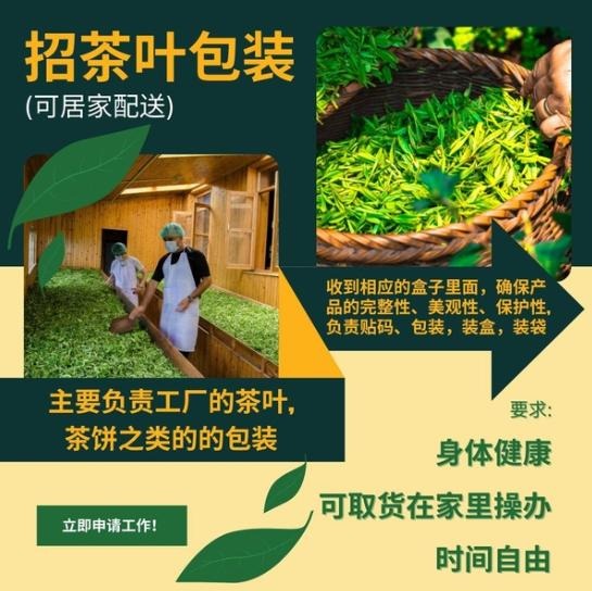 工作内容:分装茶叶、封口贴标签操作简单,不需要经验按件计薪,多劳多得,时间自由! 工资可周结,适合宝妈、学生、副业 要求:细心、家里干净、责任心强 地区:不限咨询报名: 9178777697 (未接电话,请留短信)
