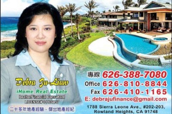 茹善晴(Debra Ju-Liaw)南加资深房地产经纪和 贷款经纪,生长在台湾台北,已融入美国移民 生活多年,秉持我们美国是一个由移民组成的 国家,为新移民和在地居民热忱服务!Debra 是一名优秀的全职资深美国加州地产经纪。 拥有加州房地产执照。十多年丰富地产经验 和专业负责,诚信可靠及用心服务於客人的态 度深受客人的好评, 信任和尊重。帮助很多美 国和中国的客人买到了他们满意而又温馨的家 ,同时和他们建立了亲密友好的关系。帮客人 买到环境好的学区房是我的专长。让您买的放 心,住的安心。