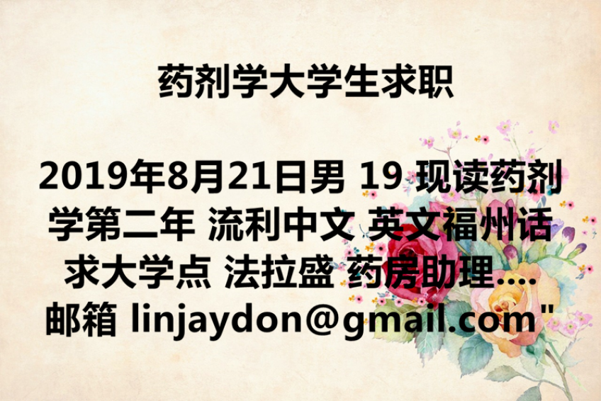 药剂学大学生求职 “男 19 现读药剂学第二年 流利中文 英文 福州话 求大学点 法拉盛 药房助理,Pharmacist Technician/Assistance 邮箱 linjaydon@gmail.com”