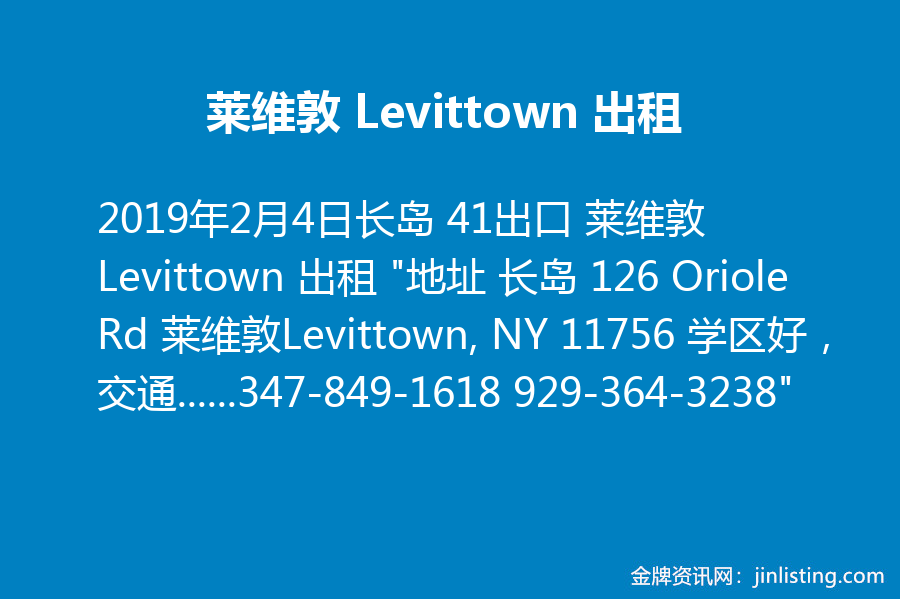 长岛 41出口 莱维敦 Levittown 出租 “地址 长岛 126 Oriole Rd 莱维敦Levittown, NY 11756 学区好,交通,购物方便。 15-18分钟车程可以到达唐人的新飞龙超市和爱新鲜超市。 自驾35-45分钟到达法拉盛。 中央暖冷。 三房,一厨,一卫。新厨房,新冰箱,新炉头。 可以分租 有意者请电:347-849-1618 929-364-3238”