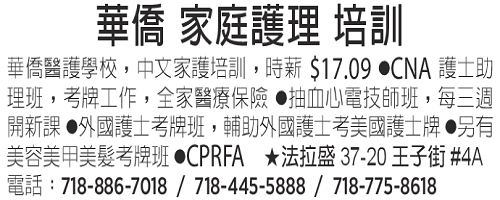 華僑醫護學校,中文家護培訓,時薪 $17.09●CNA 護士助理班,考牌工作,全家醫療保險 ●抽血班,每三週開新課●外國護士考牌班,輔助外國護士考美國護士牌●另有美容、美甲、美髮考牌班 ●CPR,FA★法拉盛 37-20 王子街 #4A電話: 718-886-7018 / 718-445-5888 或 718-775-8618