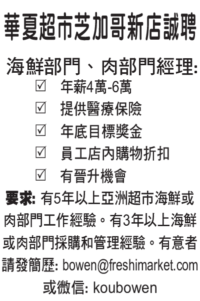 華夏超市芝加哥新店誠聘 微信: koubowen