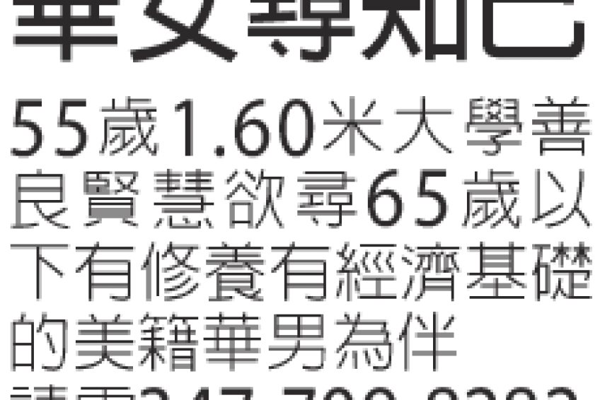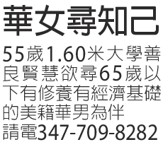 55歲,1.60米,大學,善良賢慧。欲尋65歲以下有修養有經濟基礎的美籍華男為伴。電:347-709-8282