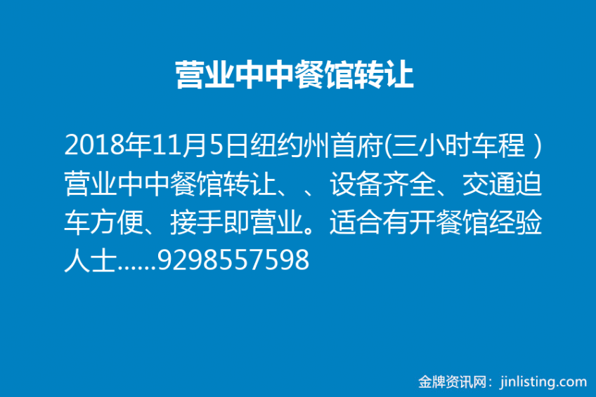 纽约州首府(三小时车程)营业中中餐馆转让、、设备齐全、交通迫车方便、接手即营业。适合有开餐馆经验人士、或一家庭人士经营、价格便宜、租金便宜、意者联系:9298557598