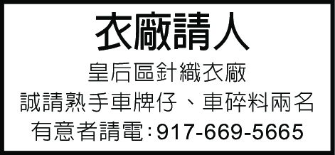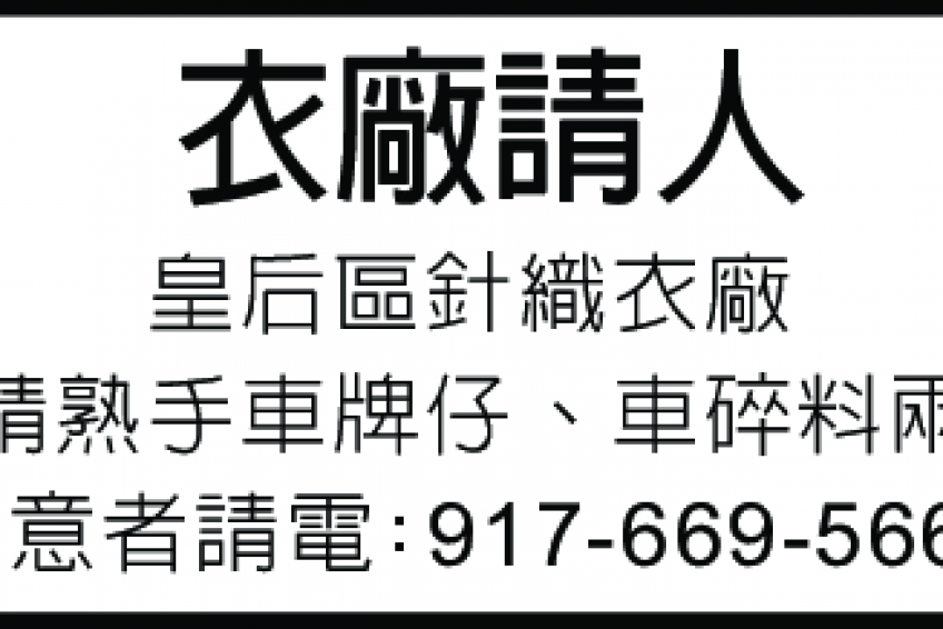 皇后區針織衣廠,誠請熟手車牌仔、車碎料兩名,有意者請電 917-669-5665