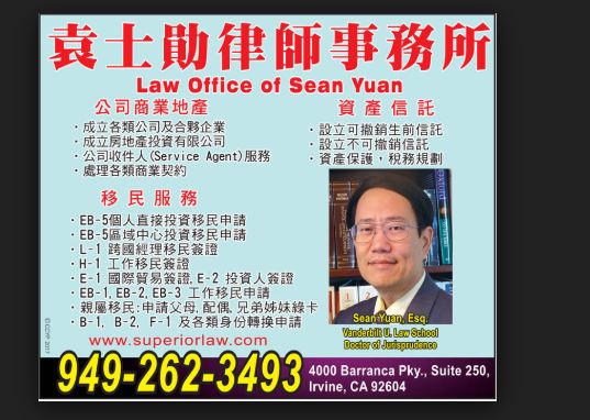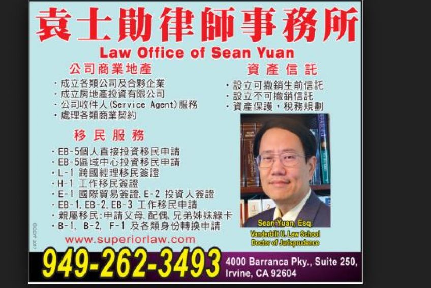 袁士勳律師 – Law Offices of Sean Yuan 註冊公司名稱:TUAN KUANG-SHENG ATTORNEY (213)383-0954