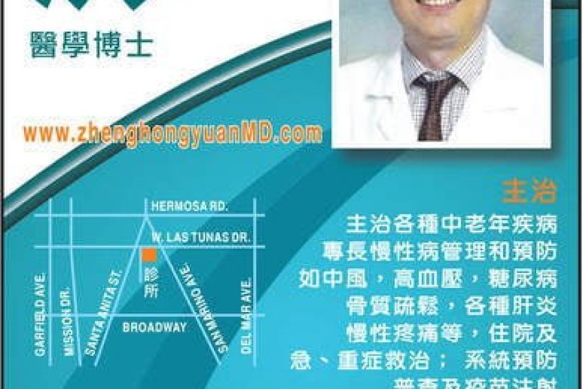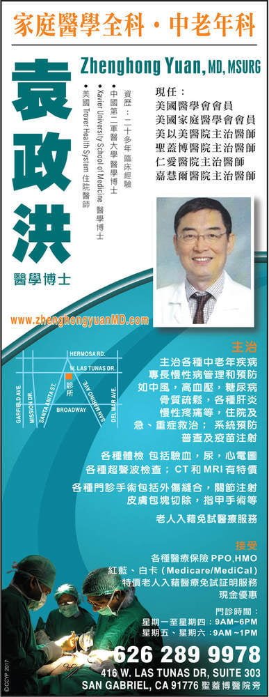 袁政洪醫學博士,是為數不多的雙醫學博士學位的全科醫師。原畢業於中國第二軍醫大學,從事醫療臨床丶教學和科研20余年,來美國後,再次獲得Xavier醫學院MD學位,從事家庭全科多年,特別在中老年科,危重癥方面甚有經驗和造詣,曾多次受邀在LA18電視臺和東森電視臺做專題講座,為華人社區的醫療健康作出了積極貢獻,享有盛譽。