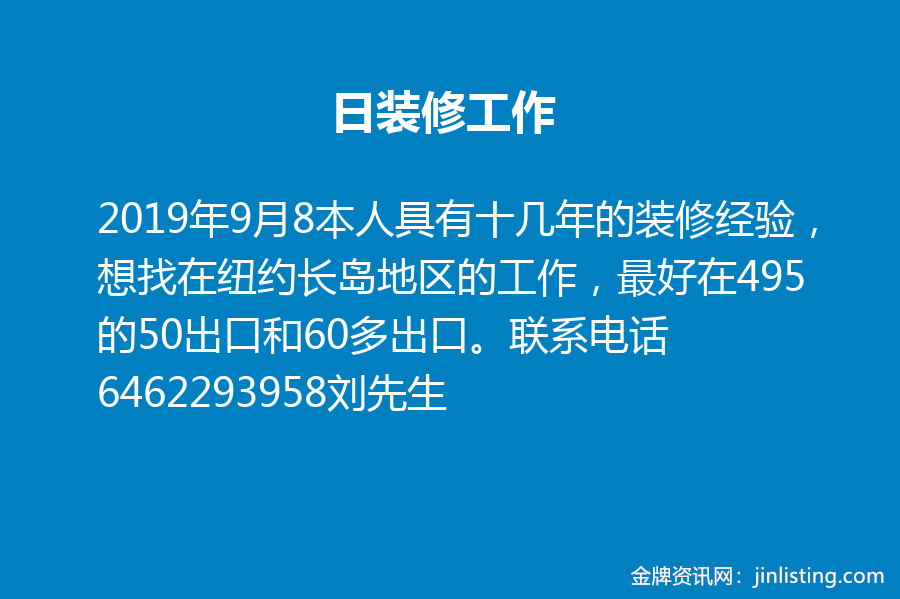 装修工作 本人具有十几年的装修经验,想找在纽约长岛地区的工作,最好在495的50出口和60多出口。联系电话6462293958刘先生