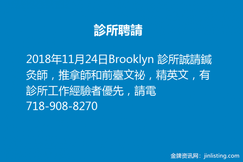 Brooklyn 診所誠請鍼灸師,推拿師和前臺文祕,精英文,有診所工作經驗者優先,請電718-908-8270