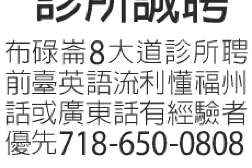 布碌崙8大道診所聘前臺,英語流利,懂福州話或廣東話,有經驗者優先。請電 718-650-0808。