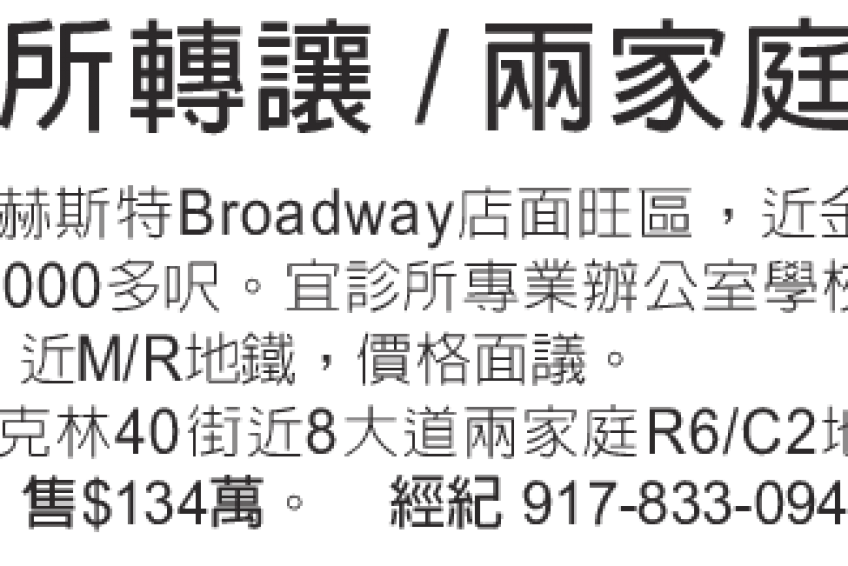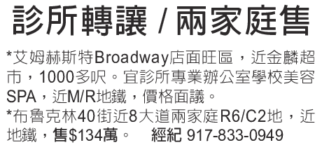*艾姆赫斯特Broadway店面旺區,近金麟超市, 1000多呎。宜诊所专业办公室学校美容SPA,近MR地鐵,價格面議 *布魯林40街近8大道兩家庭R6/C2地, 近地鐵,售134萬經紀917-833-0949