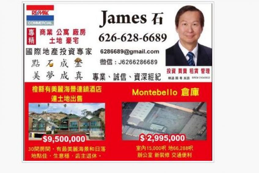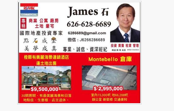 “点石成金,美梦成真”JAMES 石 精通粤, 国, 英语; 美国 REMAX 地产资深全职地产经纪, 一向本著服务地方, 献身社区的精神; 曾任加州数个社团, 协会会长, 秘书长等要职.1990 年正式成为持有加州地产执照专业经纪, 之后又取得 BROKER 执照, 从事住房, 豪宅买卖, 土地开发, 商业地产投资和仓库商铺, 办公大楼买卖出租, 管理, 谘询. 是国际地产投资专家(CIPS), 全国房地产经纪协会(NAR) 及加州房地产经纪(CAR) 注册会员, 多年来屡获销售佳绩, 并在2015,2016年荣获知名REMAX地产公司年度销售大奖, 精通中美文化及当地风土人情, 并帮助过无数买主成为快乐的屋主, 也成功的为卖主快速高价售屋, 同时也成功的协助数个商家商业地产投资和移民的目标.