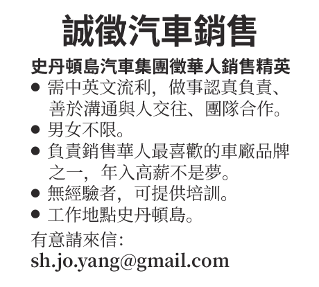 史丹頓島汽車集團誠徵華人銷售精英。
