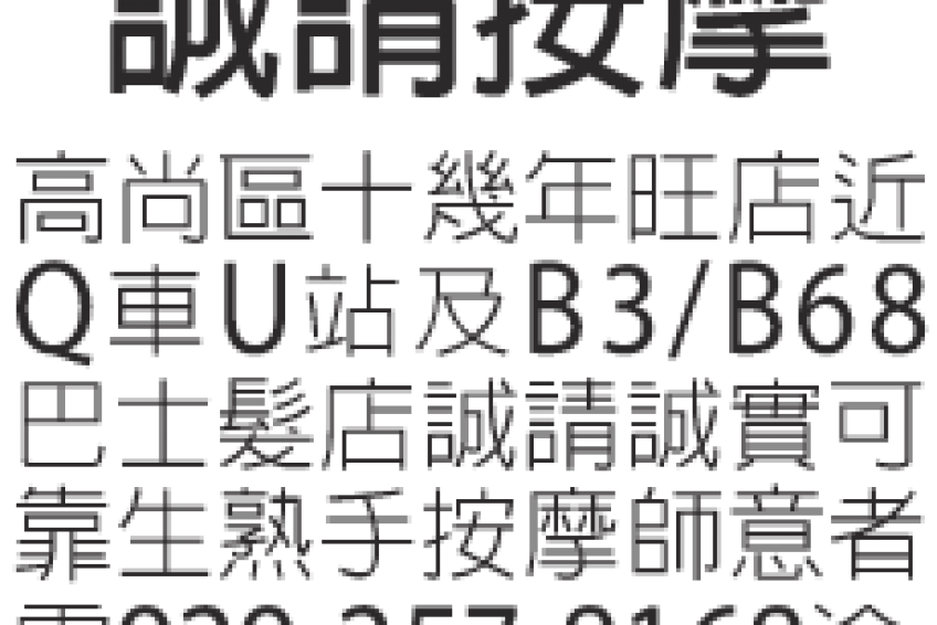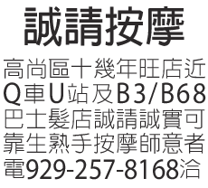 高尚區十幾年旺店近Q車U站及B3 B68巴士髮店誠請誠實可靠生熟手按摩師意者電9292578168洽