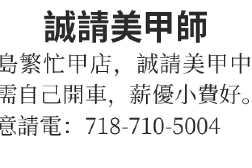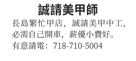 長島繁忙甲店,誠請美甲中工,必需自己開車,薪優小費好。有意請電:718-710-5004