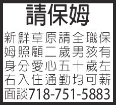 新鮮草原請全職保姆,照顧二歲男孩.有身份.愛心,五十歲左右.入住通.勤均可。薪面談。電718-751-5883