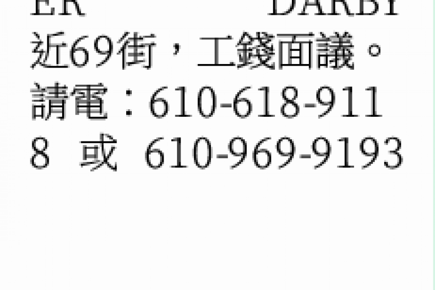 近69街,工錢面議。請電:610-618-9118或610-969-9193
