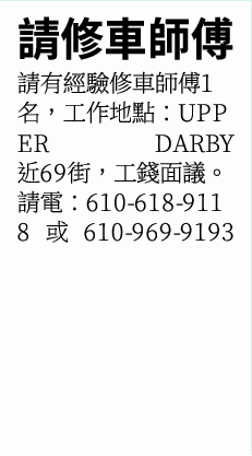 請有經驗修車師傅1名,工作地點:UPPER DARBY
