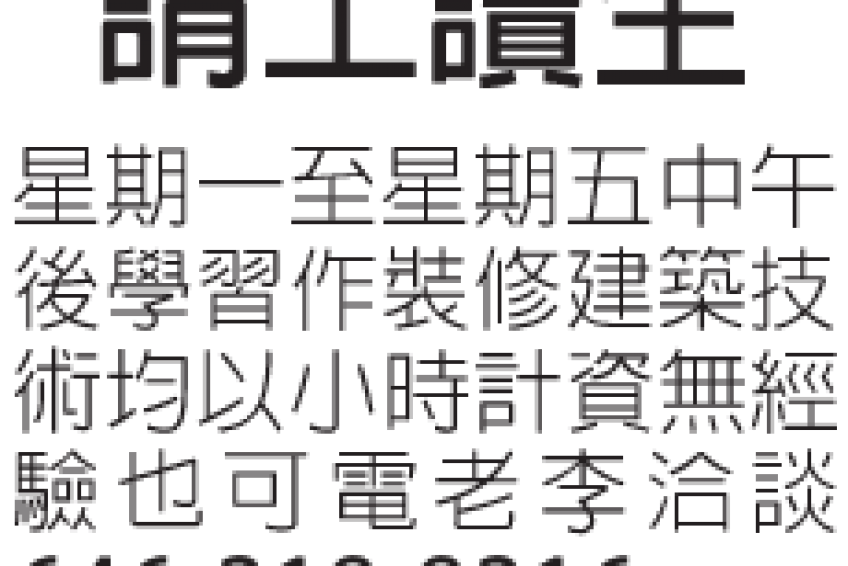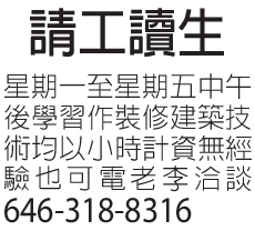 星期一至星期五中午後學習作裝修建築技術,均以小時計資無經驗也可電646-318-8316老李洽談