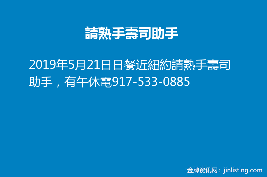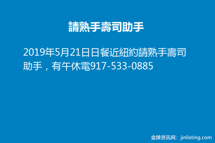 日餐近紐約請熟手壽司助手,有午休電917-533-0885
