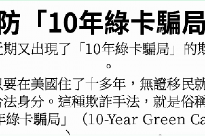 謊稱只要在美國住了十多年,無證移民就可以獲得合法身分。這種欺詐手法,就是俗稱的「10年綠卡騙局」(10-Year Green Card Scam)。