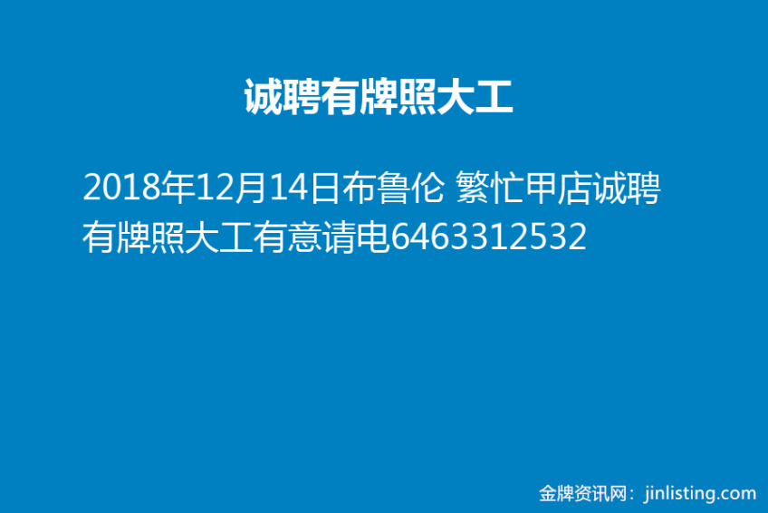 布鲁伦 繁忙甲店诚聘有牌照大工有意请电6463312532