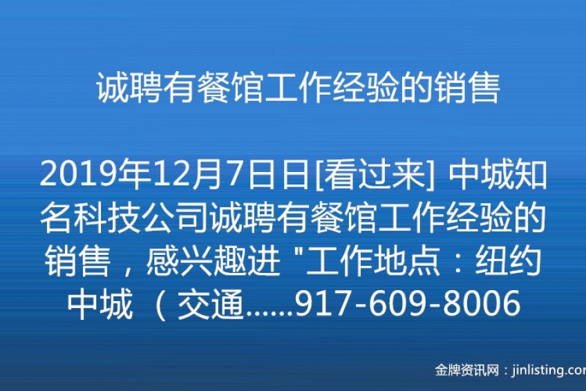 [看过来] 中城知名科技公司诚聘有餐馆工作经验的销售,感兴趣进 “工作地点:纽约中城 (交通便利,工作环境优质) 待遇: 基本工资+提成+永久residual+良好的晋升空间 -专业培训及一对一导师 -完善的福利制度(医疗保险和牙科保险及FSA) -带薪年假 -职业发展前景广阔 -工作时间灵活 联系方式: E-mail: fllin@menusifu.com 电话:917-609-8006 请有意者请将简历发至fllin@menusifu.com,详细要求如下 岗位职责: 1.通过寻找相关渠道等各种途径开发新客户 2. 与老客户保持联系并定期联系或拜访,进行产品的宣传和销售 3. 了解客户需求,促成客户成交 4. 协助团队跟进重点核心客户 5. 及时交接完成订单处理 要求: 1.有餐馆从业经验者优先 2.勤奋认真,对工作有热情者优先。 3.性格外向,善沟通者优先 4.基本英文沟通,会说粤语,福州话者优先”