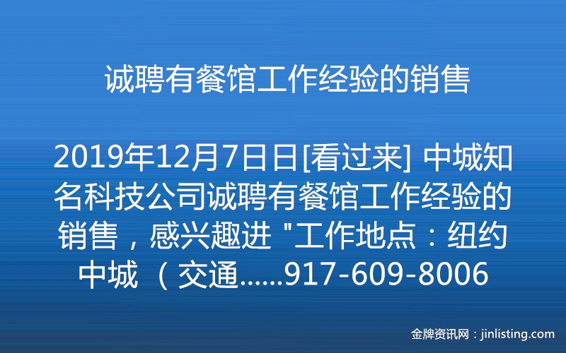 诚聘有餐馆工作经验的销售 917-609-8006