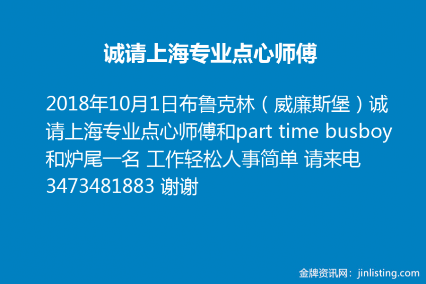 布鲁克林(威廉斯堡)诚请上海专业点心师傅和part time busboy和炉尾一名 工作轻松人事简单 请来电3473481883 谢谢