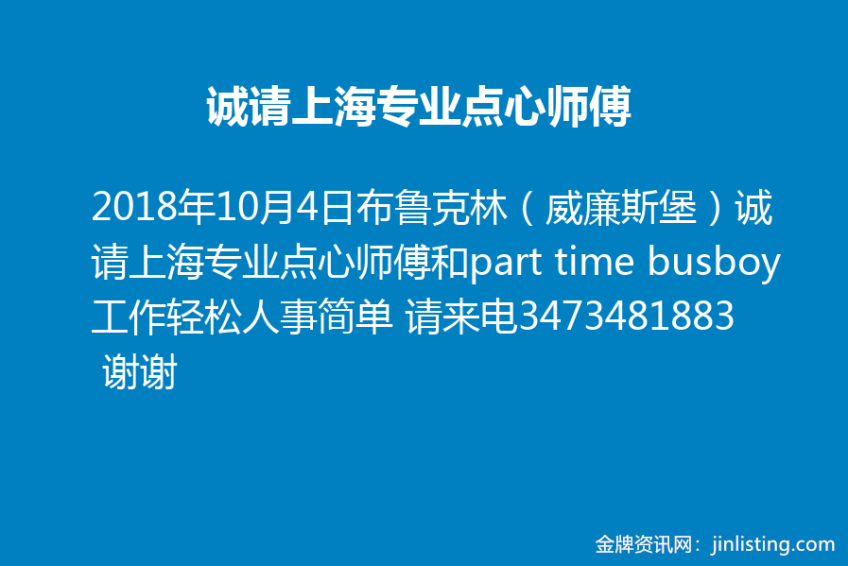 布鲁克林(威廉斯堡)诚请上海专业点心师傅和part time busboy工作轻松人事简单 请来电3473481883 谢谢