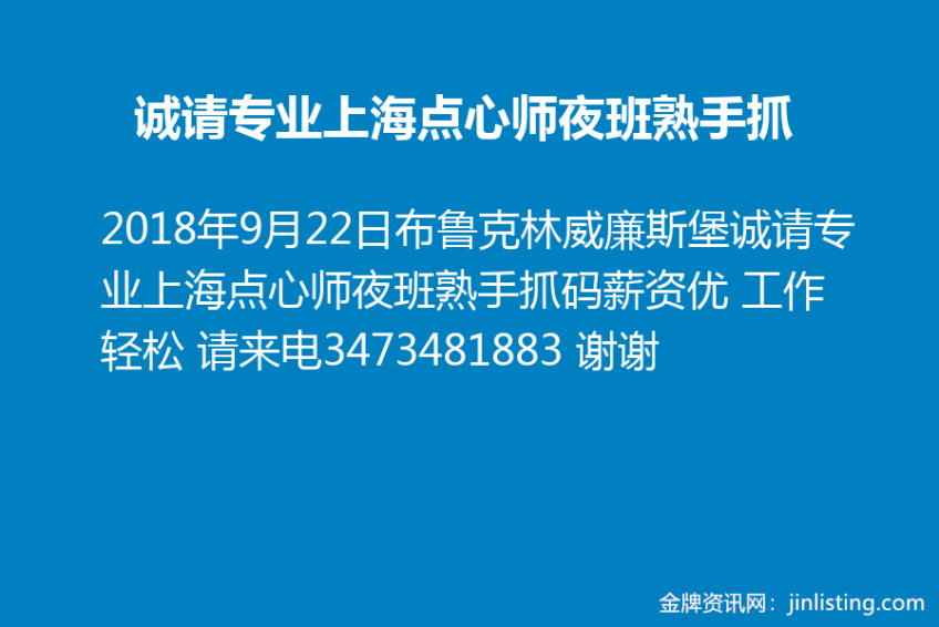 布鲁克林威廉斯堡诚请专业上海点心师夜班熟手抓码薪资优 工作轻松 请来电3473481883 谢谢