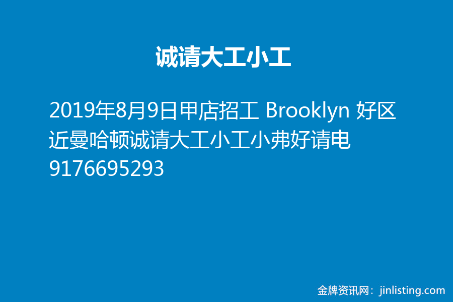 甲店招工 Brooklyn 好区近曼哈顿诚请大工小工小弗好请电9176695293