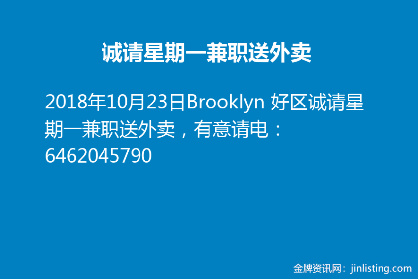 Brooklyn 好区诚请星期一兼职送外卖,有意请电:6462045790