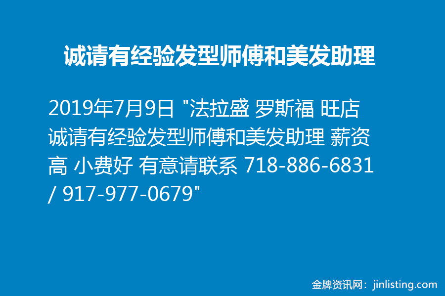 “法拉盛 罗斯福 旺店诚请有经验发型师傅和美发助理 薪资高 小费好 有意请联系 718-886-6831/ 917-977-0679”