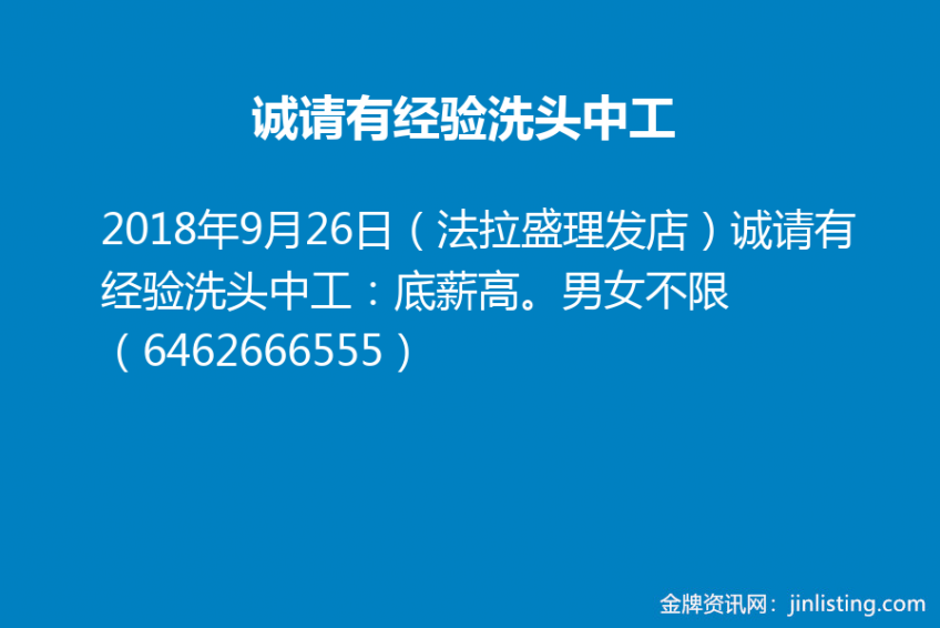 ❤️(法拉盛理发店)诚请有经验洗头中工:底薪高。男女不限 (6462666555)