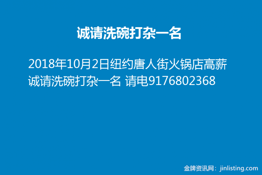 纽约唐人街火锅店高薪诚请洗碗打杂一名 请电9176802368