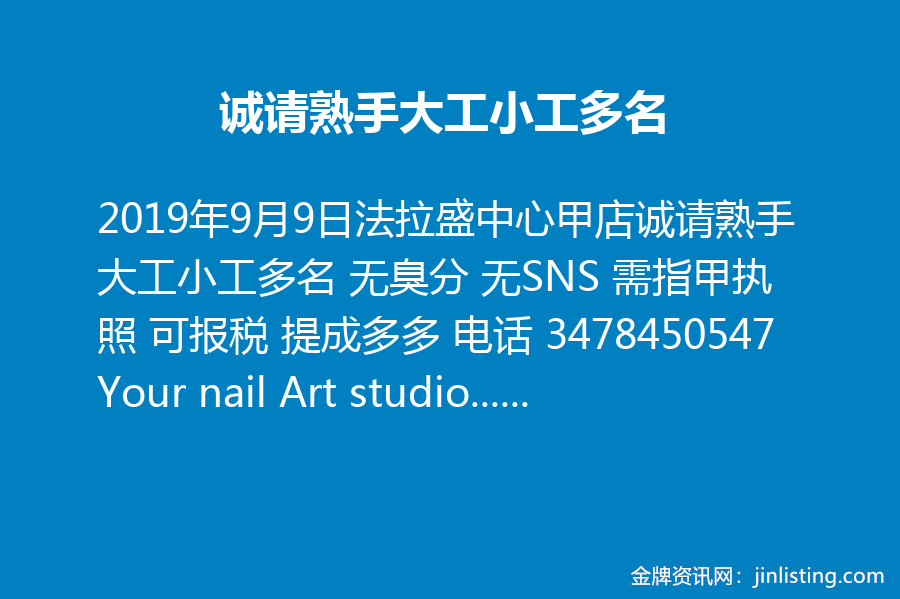 法拉盛中心甲店诚请熟手大工小工多名 无臭分 无SNS 需指甲执照 可报税 提成多多 电话 3478450547 Your nail Art studio法拉盛中心甲店诚请熟手大工小工多名 无臭分 无SNS 需指甲执照 可报税 提成多多 电话 3478450547
