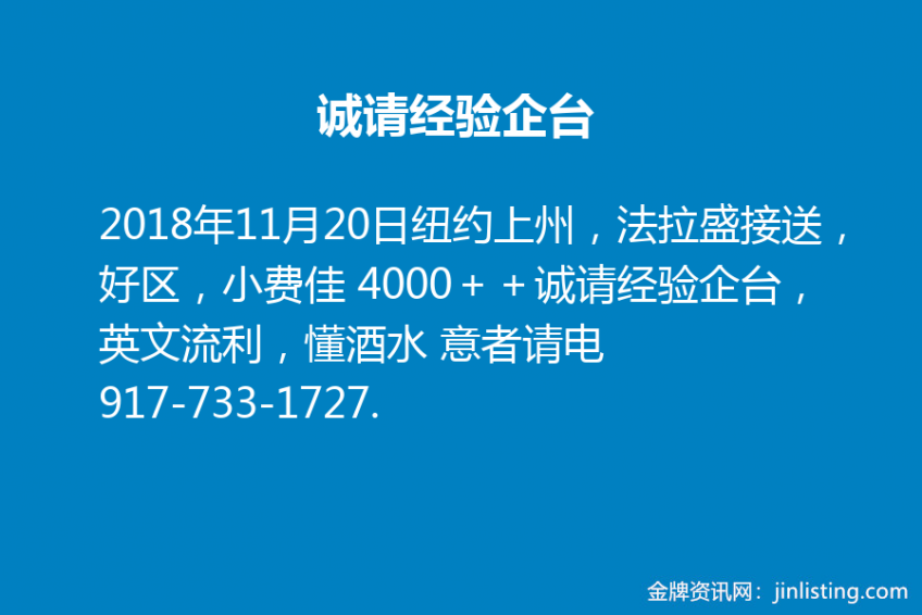 纽约上州,法拉盛接送,好区,小费佳 4000++诚请经验企台,英文流利,懂酒水 意者请电917-733-1727.