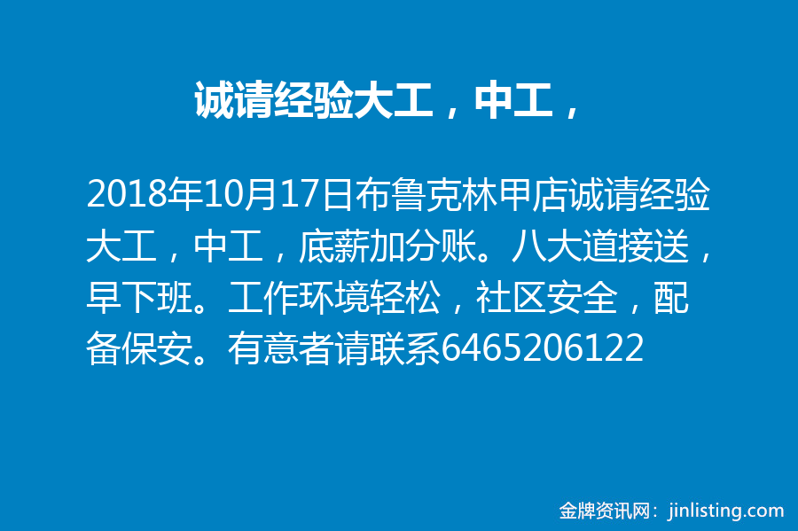 布鲁克林甲店诚请经验大工,中工,底薪加分账。八大道接送,早下班。工作环境轻松,社区安全,配备保安。有意者请联系6465206122