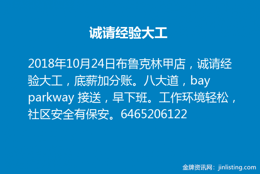 布鲁克林甲店,诚请经验大工,底薪加分账。八大道,bay parkway 接送,早下班。工作环境轻松,社区安全有保安。有意者请电6465206122
