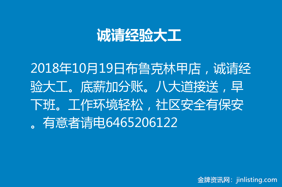 布鲁克林甲店,诚请经验大工。底薪加分账。八大道接送,早下班。工作环境轻松,社区安全有保安。有意者请电6465206122