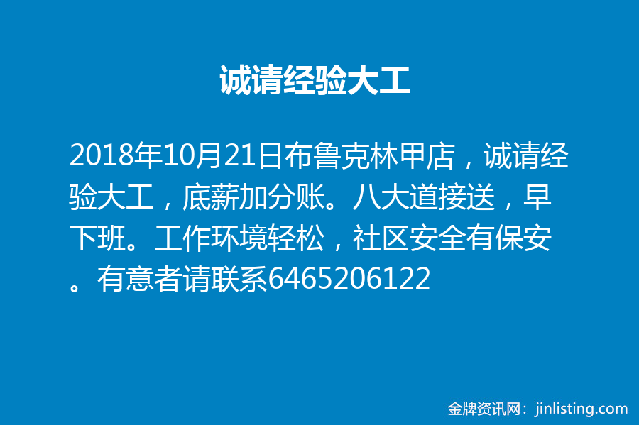 布鲁克林甲店,诚请经验大工,底薪加分账。八大道接送,早下班。工作环境轻松,社区安全有保安。有意者请联系6465206122