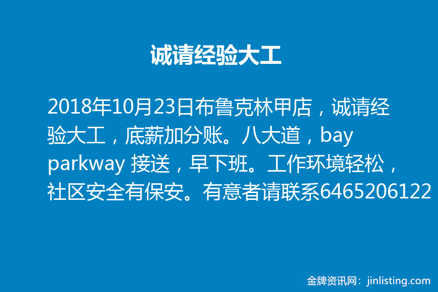 布鲁克林甲店,诚请经验大工,底薪加分账。八大道,bay parkway 接送,早下班。工作环境轻松,社区安全有保安。有意者请联系6465206122